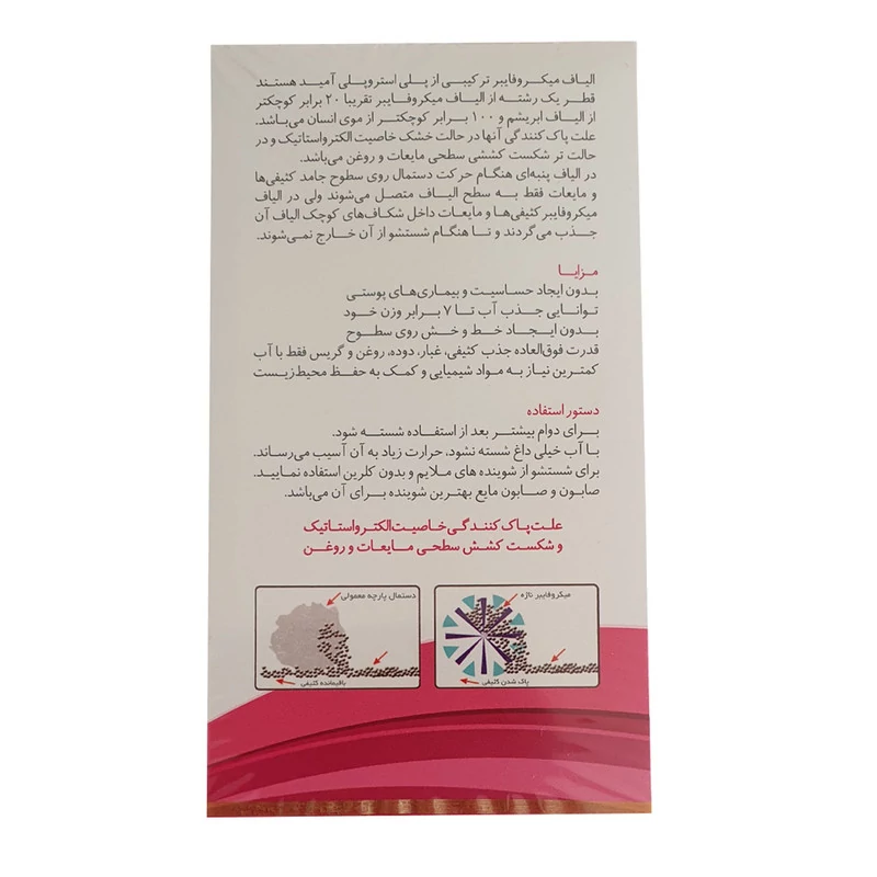 لطفا توجه داشته باشید جعبه دستمالهای میکرو فایبر فاقد سلفون و نوار آسان باز شو (ایزی اپن) تقلبی هستند و خاصیت الکترواستاتیک و جذب آب ندارند.